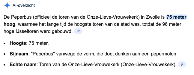 Wanneer je tegenwoordig een vraag stelt aan Google, zoals: 'Hoe hoog is de Peperbus in Zwolle?’ krijg je een antwoord van AI. Dit antwoord wordt gebaseerd op bestaande content en AI bundelt deze bronnen samen en vormt zo een antwoord. Bovendien worden aan het einde van een Google AI Overview de bronnen getoond waar de antwoorden op zijn gebaseerd.